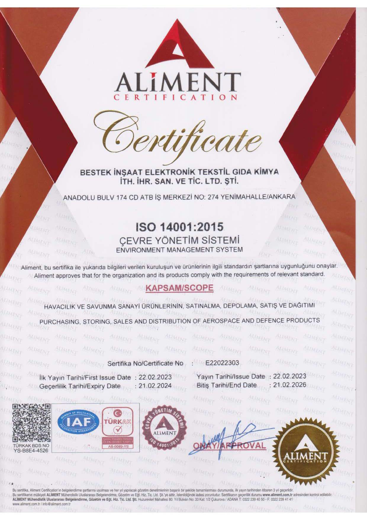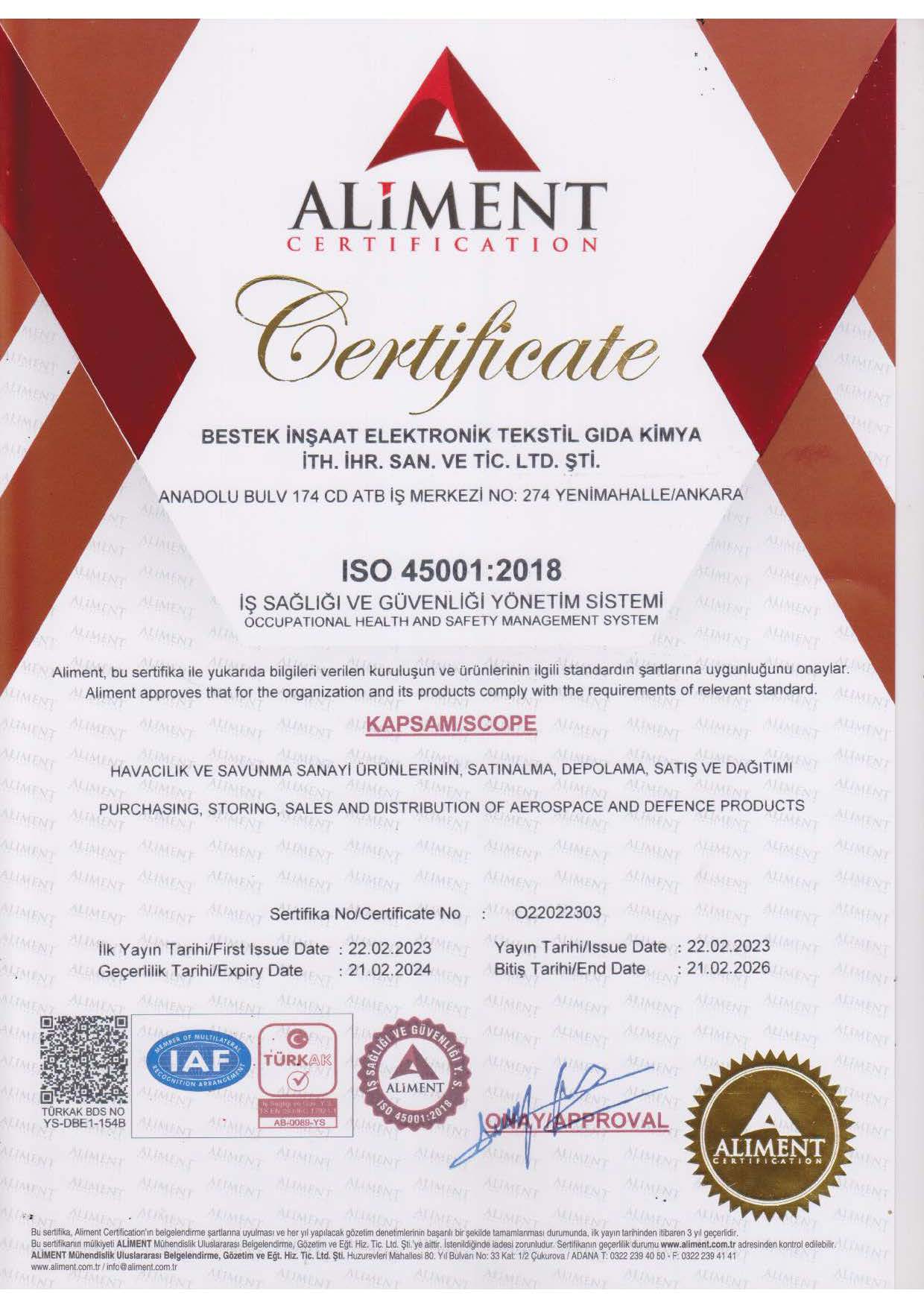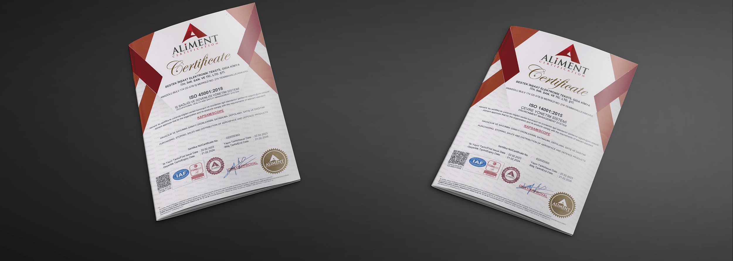 Şirketimiz özellikle, havacılık ve savunma sanayi müşterilerinin taleplerini karşılayabilmek için 2021 yılında ISO AS 9120 kalite denetim ve belgelendirme sürecini başlatmıştır. Hali hazırda, ISO AS 9120, ISO 9001, ISO 14001 ve ISO 45001 tüm kalite belgelerine sahiptir. Ayrıca AS9120 sertifikamız, ISO9001:2015’i de kapsamaktadır.
